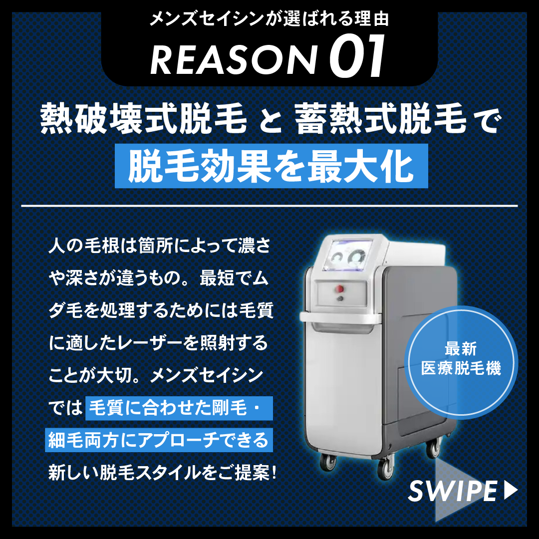 人の毛根は箇所によって濃さや深さが違うもの。だから、最短でムダ毛処理をするためには毛質に適したレーザーを照射することが大切です。メンズセイシンでは毛質に合わせてあらゆる深さの剛毛・細毛両方にアプローチできるあたらしい脱毛スタイルを提案しているので、「他のクリニックで脱毛していたけど効果を感じられなかったという人」や「脱毛効果をしっかり出したいと考えている人」にはメンズセイシンの熱破壊式脱毛×蓄熱式脱毛×3波長同時照射のハイブリッド脱毛がオススメです。