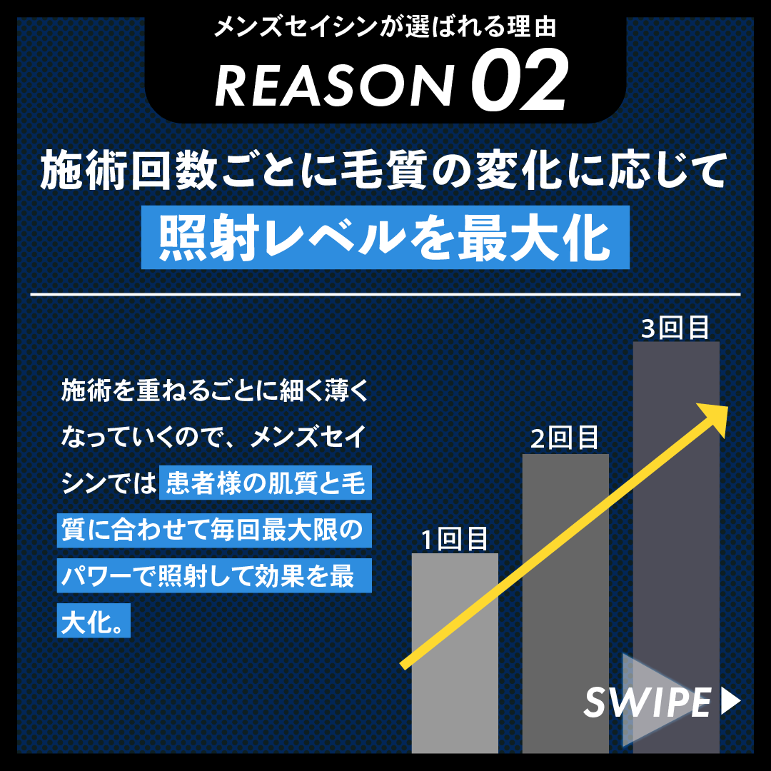 毛が密集していて濃いと施術初期の段階だと、照射によって肌内部に発生する熱エネルギーが高くなり火傷になるリスクが高くなります。施術回数を重ねるごとに肌内部で発生する熱量の総和が低くなるので、そのぶん照射パワーを上げて脱毛効果を最大化できます。