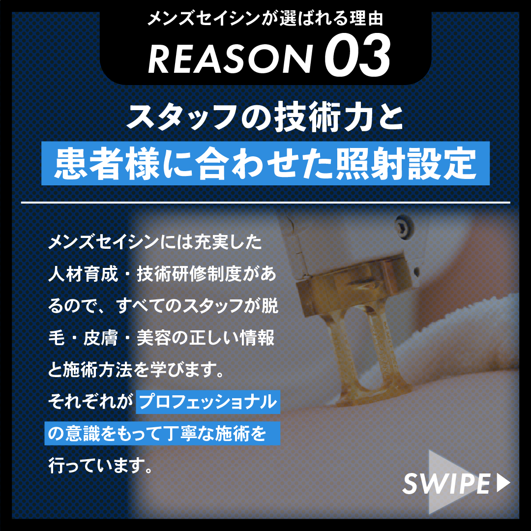 メンズセイシンでは充実した人材育成・技術研修制度があるので、すべてのスタッフが脱毛・皮膚・美容の正しい情報と施術方法を学びます。それぞれがプロフェッショナルの意識をもって丁寧な施術を行っています。