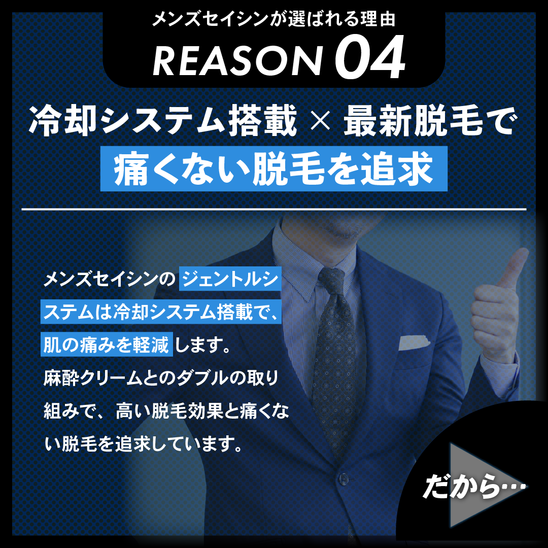 メンズセイシンは「熱破壊式脱毛×蓄熱式脱毛×医療レーザー脱毛で使用される3波長同時照射」で脱毛効果を最大化するジェントルシステム搭載の最新脱毛機を導入!最新の脱毛機だからこその安さと効果を実現します。そんなメンズセイシンの5つの特徴を紹介します。