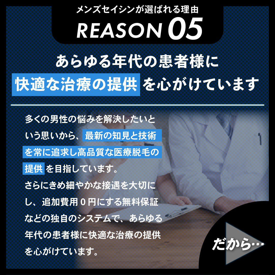 メンズセイシンでは、多くの男性の悩みを解決したいという思いから、最新の知見と技術を常に追求し高品質な医療脱毛の提供を目指しています。さらにきめ細やかな接遇を大切にし、追加費用0円にする無料保証などの独自システムで、あらゆる年代の方に快適な治療の提供を心掛けているクリにニックです。