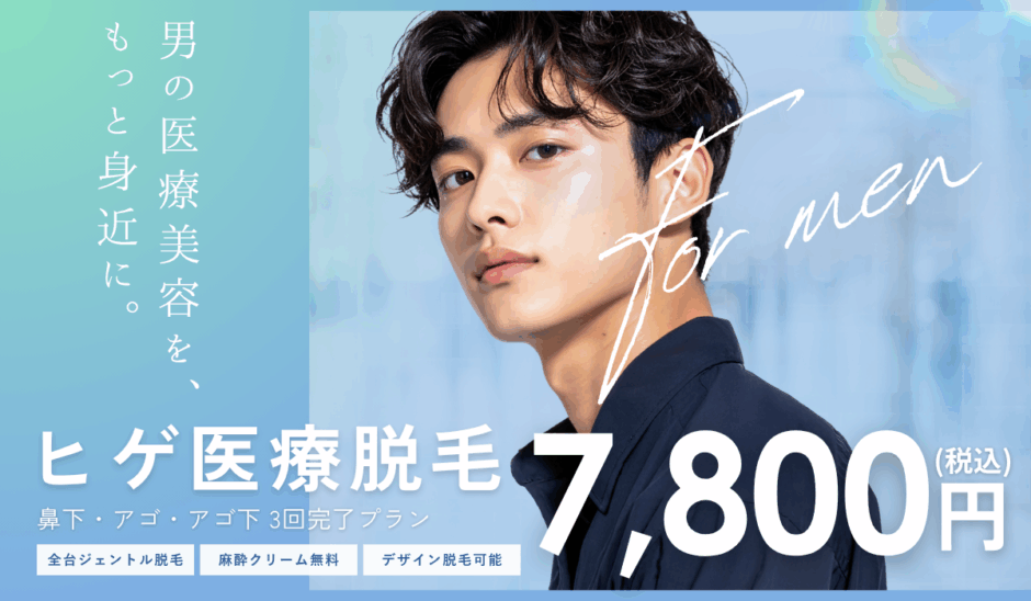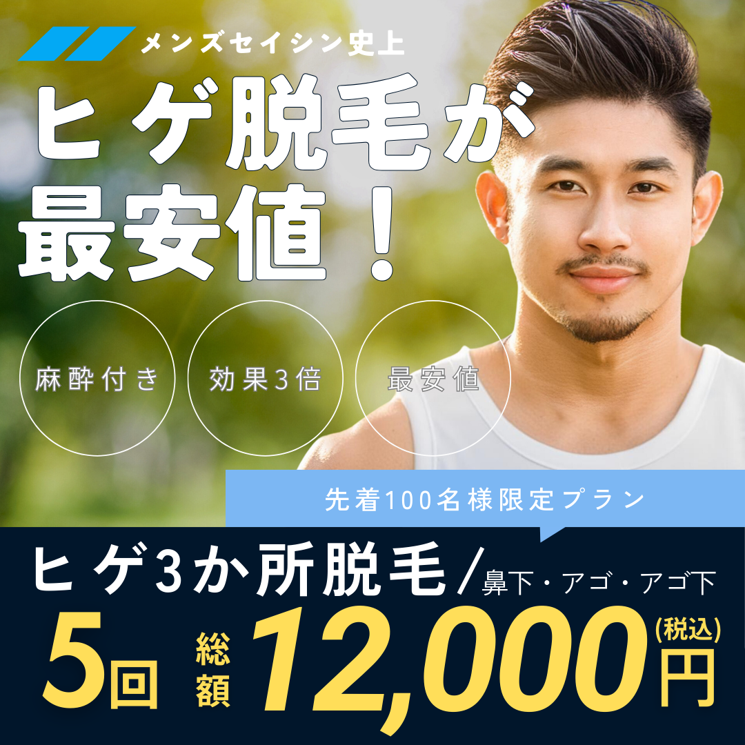 メンズセイシンはヒゲ脱毛3か所5回12,000円と、梅田・京都・三宮の関西エリアで最安値でヒゲ脱毛を提供しているメンズ医療脱毛専門クリニックです。また、メンズセイシンでは全身脱毛もエリア最安値で、全身脱毛5回99,000円!しかも、このプランを契約するとヒゲ脱毛が無料なので、全身脱毛もヒゲ脱毛もトータルで脱毛を検討している人にはおすすめのメンズ脱毛クリニックです。
